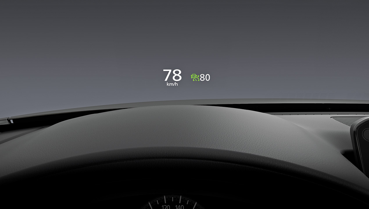 Equipado con la Pantalla Activa de Conducción*, que proyecta en el panorámico la información esencial de manejo, como velocidad instantánea, velocidad crucero e información de las alertas de seguridad i-Activsense *Aplica para Mazda3 Grand Touring MHEV y Mazda3 Grand Touring LX Carbon Edition.